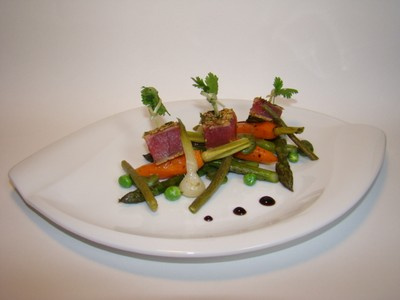 Tranchez les pavés en petits cubes, et ajoutez sur chacun un pic. Répartissez harmonieusement les petits légumes dans chaque assiette, puis dessus 3 petits cubes de thon rouge mi-cuit. Décorez avec quelques brins de coriandre, puis un peu de balsamix et servez sans attendre !