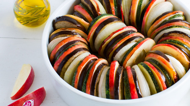 Revisité avec des pommes, celles-ci apportent une touche fruitée et originale à ce plat à base de légumes d'été ! La tenue et la fermeté des pommes Pink Lady® à la cuisson, permet une harmonie de textures très agréable entre tous les légumes.