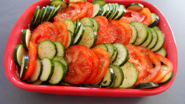 Les disposer dans le plat de la manière suivante : une couche de courgette puis une couche de tomate. Et recommencer.