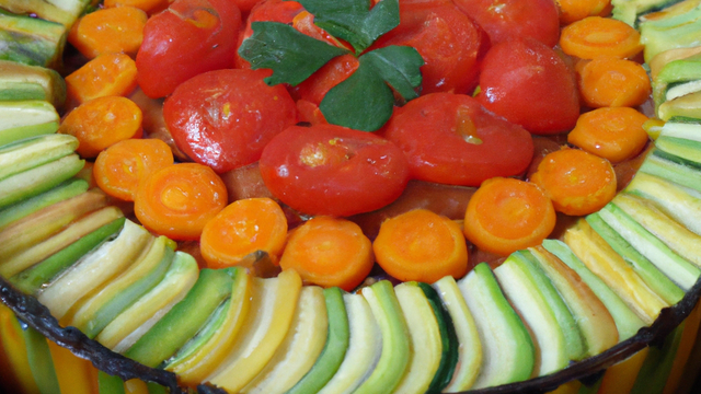 Versez le coulis de légumes dans un grand plat. Disposez par-dessus les lanières de légumes, en les alternant et en les serrant bien.