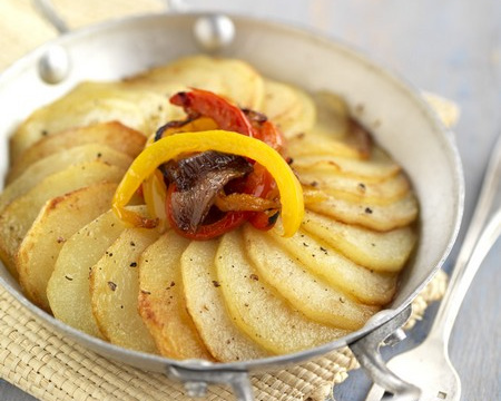 Épluchez les Primeurs de Camargue, taillez-les en fines tranches, rincez-les sous l'eau chaude. Répartissez la préparation aux poivrons dans le fond de quatre petits plats, rangez les rondelles de pommes de terre dessus en rosace. Versez le reste d'huile d'olive sur les Primeurs de Camargue, assaisonnez, mettez les tians à cuire 15 à 20 minutes au four préchauffé thermostat 6/7. Servez bien chaud.