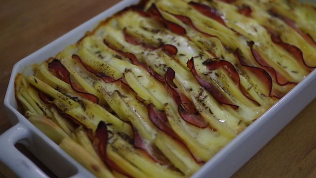 Au fond de votre plat à gratin disposez les oignons. Rangez ensuite vos ingrédients sur la tranche en alternant une rangée de pommes-de-terre, une rangée de fromage, une rangée de pommes-de-terre et une rangée de jambon. Saupoudrez de poivre et de cumin, et disperser la crème.