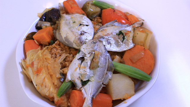 Quand le riz est cuit, verser dans un plat au centre, puis disposer les légumes tout autour et terminer par les poissons grillés sur le riz.