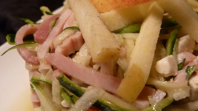 Prendre un emporte pièce et le garnir, décorer sur le dessus de quelques bâtonnets de pomme.