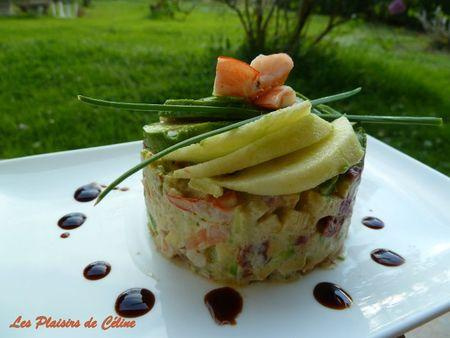 Décorez avec les lamelles de pommes et d'avocat et une petite crevette . Réservez au frais.