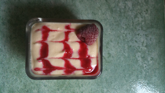 Mettre 1 demi verre de coulis de framboise dans une assiette creuse