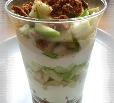 Préparez vos verres de tiramisu en alternant une couche de spéculoos, une couche de crème, une couche de pomme, une couche de crème et terminez par des dés de pommes.