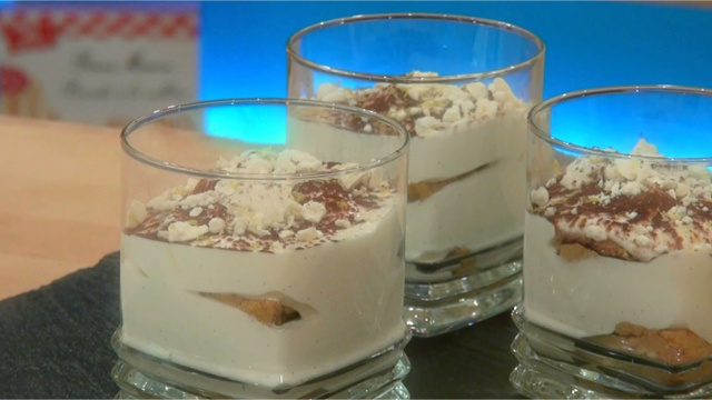 Couper les biscuits en deux et les tremper dans la préparation au café. Les mettre au fond d'une verrine et ajouter une première couche de crème montée, puis recommencer avec les biscuits trempés et terminer la crème. Recommencer pour chaque verrine.