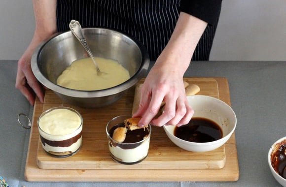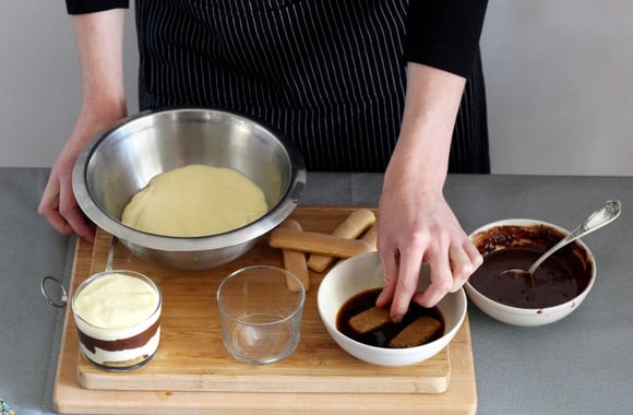 8Trempez un biscuit boudoir rapidement dans le café et disposez-le au fond de la verrine. Renouvelez l'opération pour chaque verrine.