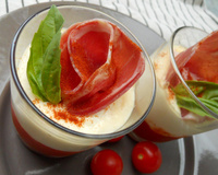 Pour la présentation, ajoutez une tranche de coppa, une feuille de basilic et un peu de paprika sur chaque verrine.