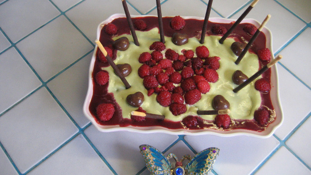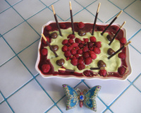 - 6Sortir du frigo le plat pour déguster et, au moment de servir, répartir les framboises en faisant le dessin de votre choix. En touche finale, ajouter du coulis de framboises, les mikados et les petits cœurs en biscuit pour décorer.
