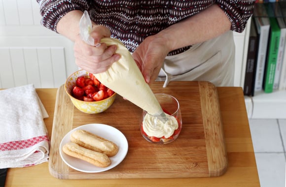 7Ajoutez de la crème au mascarpone, 1 biscuit cuillère imbibé et coupé en deux et 2 cuillères à soupe de dés de fraises.