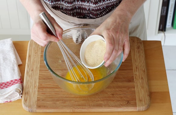 1Dans un grand bol, fouettez les jaunes d’oeuf avec 80 g de sucre.