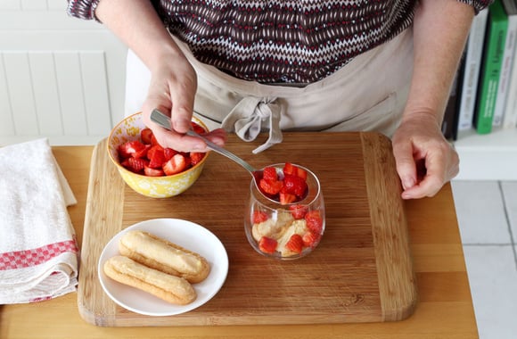 Dans chaque verrine, mettez 1 biscuit cuillère imbibé et coupé en deux et 2 cuillères à soupe de dés de fraises.