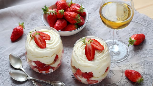 9Au moment de servir, ajoutez sur chaque verrine une fraise coupée en deux. Servez avec un verre de Monbazillac ou de Haut-Montravel.