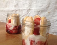Fouetter les yaourts et, y mélanger légèrement une cuillère de confiture de fraise afin d obtenir des zébrures. Séparer de façon équitable les yaourts dans deux récipients. Repartir également la première moitié de yaourt dans les 4 vérrines.