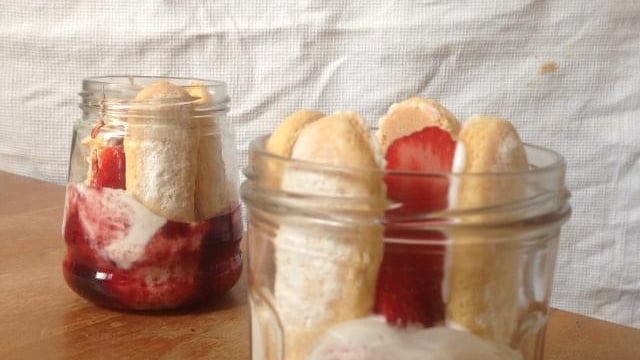 Mettre une cuillère à soupe de confiture au fond de la vérrine. Disposer 3 biscuits cuillère par verrine de façon verticale, contre les parois.