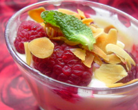 Ce dessert est excellent avec des framboises fraiches mais l'on peut utiliser sans soucis des framboises surgelées que l'on mettra sans les dégeler auparavant