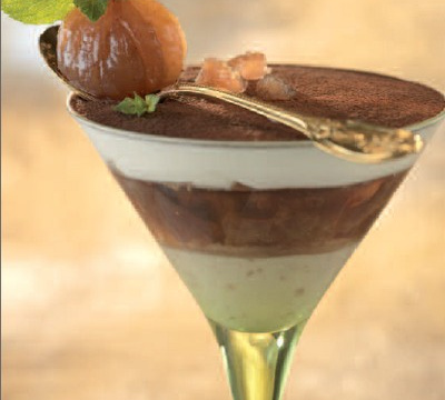 Sortez les coupes du réfrigérateur, disposez les biscuits et les brisures de Marrons Glacés et recouvrez avec de la crème de mascarpone.