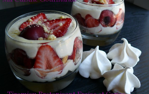 Une crème au mascarpone vanillé, des fraises, des cerises et des brisures de galette bretonne...miom!