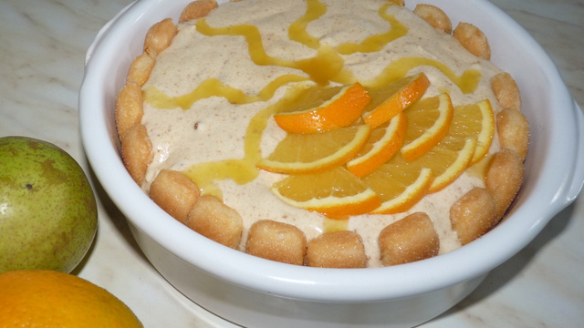 Ce gâteau utilise une base de tiramisu arrangée avec des biscuits (biscuits à la cuillère et spéculoos) et des fruits (sirop et rondelles d'orange). Comme il n'y a pas de cuisson, les enfants peuvent le faire facilement et ils se régalent rien qu'en le préparant !