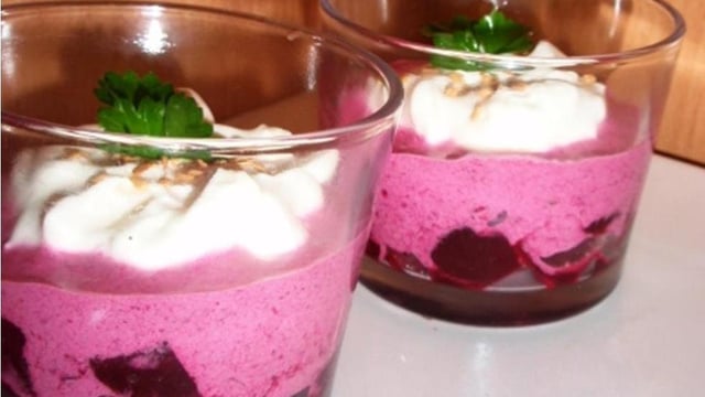 Répartir les dés de betteraves dans les verrines, sur le dessus ajouter la crème betterave-mascarpone puis déposer une c à s de crème chantilly.