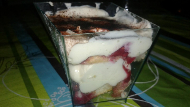 Tapisser les verrines de biscuits. Recouvrir de coulis et de quelques framboises, étalez par dessus une couche de crème, œuf, sucre, mascarpone.