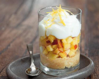 Dans une assiette creuse, versez le jus de pêche détendu avec l'eau, imprégnez les palets bretons de façon à les assouplir sans les détremper et les déposer dans le fond de la verrine.