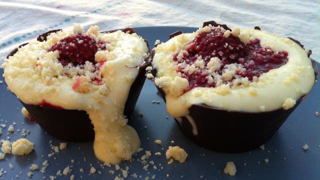 Au dernier moment, dans le panier au chocolat, superposer une couche de mascarpone, une couche de framboise, une couche de biscuits puis renouveler.