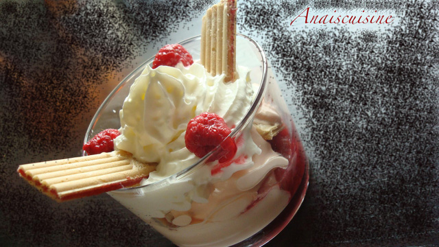 Mettre quelques framboises coupées en deux et une gaufrette coupée en morceaux au fond de chaque verrines.