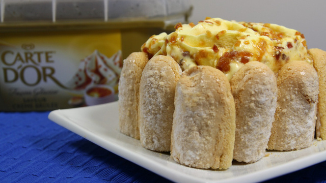 Dans un cercle, un emporte-pièce carré ou tout simplement un moule, disposer sur le fond les biscuits à la cuillère imbibés rapidement dans le café. Puis recouvrir d'une couche de glace, de préférence en conservant les rosettes de Crème glacée Carte d'Or® Façon Glacier Saveur Crème Brûlée sur le dessus.