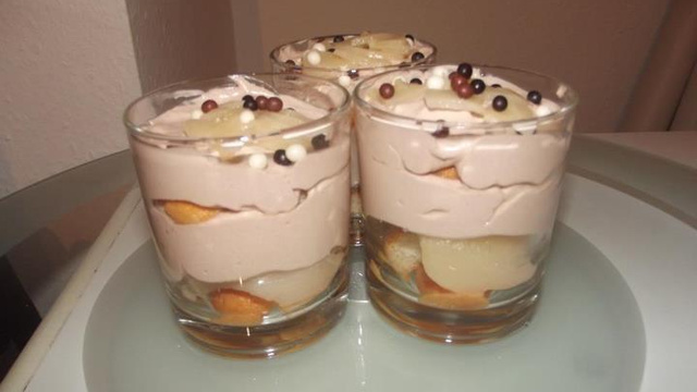 Trempé des boudoirs dans du jus de poire, les installer au fond d'un verre, puis recouvrir de poire coupée, puis de préparation au mascarpone et ainsi de suite, finir par la déco et laisser poser au frigo 4h.