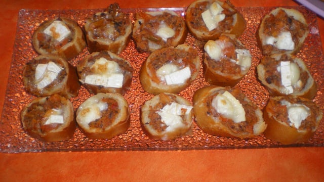 Mettre le mélange sur les rondelles de pain. Ajouter un morceau de fromage.