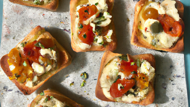 Une fine tranche de pain grillée, tartinée au pesto et recouverte de tomate, jambon cru et mozzarella doré au four.