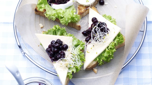 Toastez légèrement le pain de mie. Laissez refroidir. Tartinez les tranches de pain avec du beurre et garnissez-les avec les feuilles de salade et les deux fromages. Coupez les tartines en triangles. Parsemez-les de pousses d'alfalfa et placez-y un peu de la trempette aux myrtilles. Servez le reste de la trempette séparément.