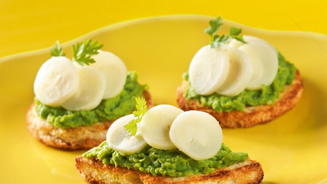 Napper les ronds de pain de purée de petits pois, surmonter de rondelles de cœurs de palmiers en rosace.