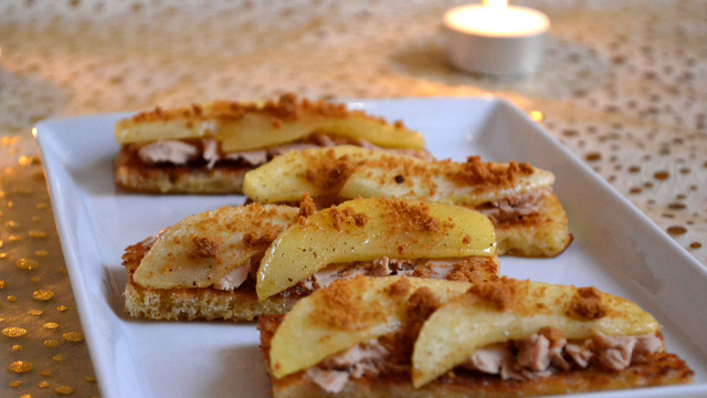 Tartinez les toasts de pain perdu avec le foie gras, ajoutez quelques tranches de pommes et saupoudrez de miettes de spéculoos.