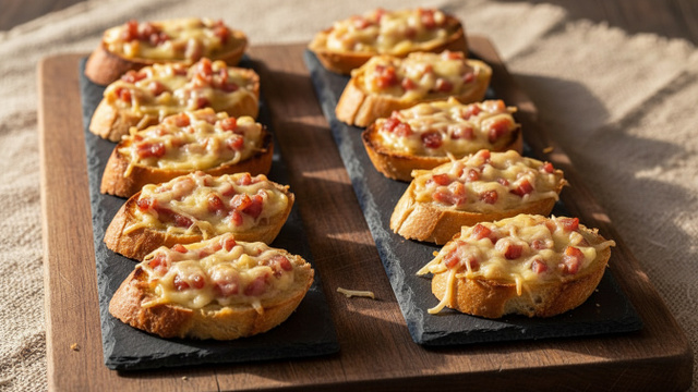 Couper des tranches de baguette assez fine,mettre la creme fraiche, le lardon et un peu de gruyere,et passer au grille 3mn, c'est pret