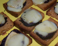 Couper une tranche de pain d'épice en deux, déposer une rondelle de boudin noir, mettre un morceau de pomme sur la tranche de boudin, et un morceau de cantal sur la pomme.