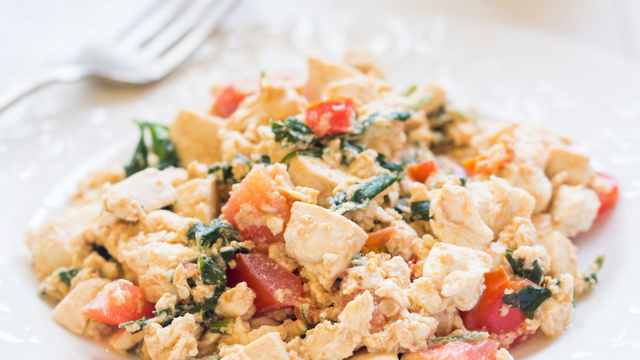 Les oeufs brouillés revisités en version vegan et à base de tofu. A personnaliser aux légumes de saison et épices de son choix.