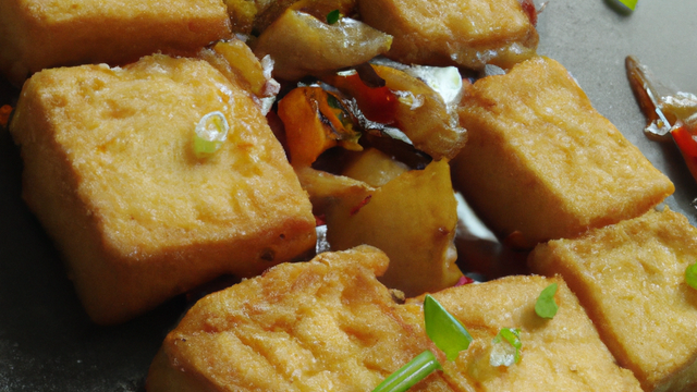 Tofu mariné pendant 1 heure avec des lamelles de gingembre confit, de l'huile de sésame et du cumin, pané dans de la fécule, puis frit à la poêle. Servi comme des « frites » avec une compotée d'oignons doux à la sauce teriyaki.