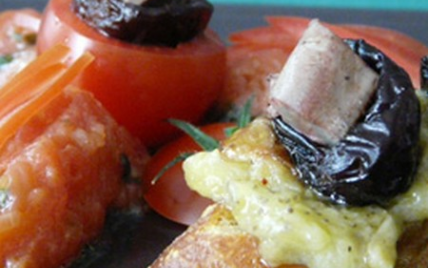 Petits sandwiches de pain grillé garnis de pruneaux d'Agen farcis au foie de volaille des Landes, caviar d'aubergine et concassée de tomates de Marmande.
