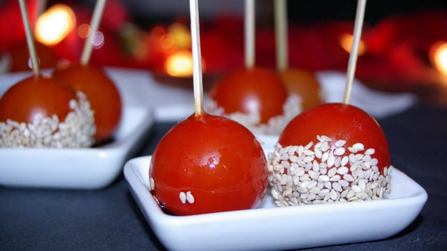 Tomate cerise au caramel et sésame