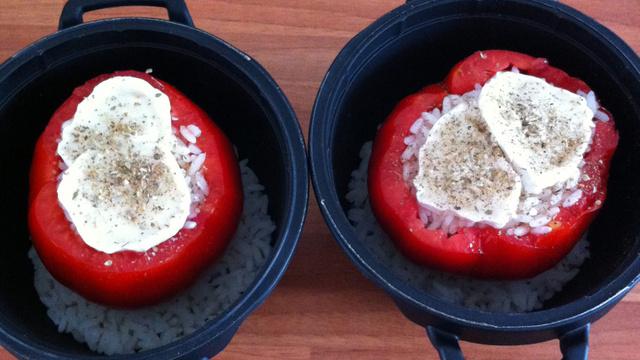 Mettre le reste de riz dans les tomates et recouvrir les tomates farcies avec 30g de fromage de chèvre chacune. - 4