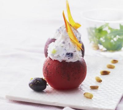 A l'aide d'un couteau, incisez la base des tomates en croix, retirez les pédoncules et plongez-les dans l'eau bouillante 20 secondes. Refroidissez-les aussitôt dans l'eau glacée puis épluchez-les. Coupez le chapeau des tomates et retirez un tiers de pulpe. A l'aide d'un chalumeau, brûlez les tomates à l'envers très rapidement. Si vous n'en avez pas, passez quelques secondes les tomates sous le grill du four afin de les brunir légèrement.