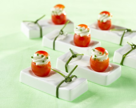 Garnissez les tomates cerise avec une poche à douille.