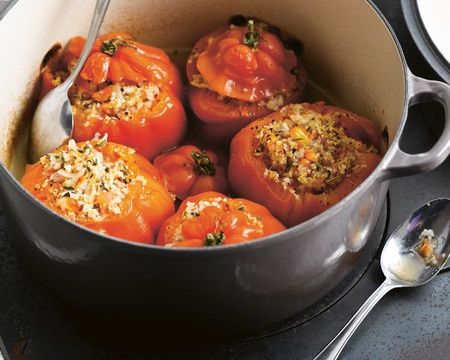 Remplissez les tomates de ce mélange, disposez-les dans une cocotte et versez le bouillon de légumes par-dessus. Recouvrez les tomates de leur chapeau, couvrez et enfournez pendant 30 à 35 min dans un four préchauffé à 200°C.