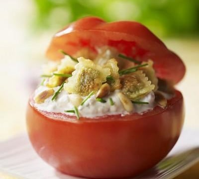 Découpez le chapeau de chaque tomate et creusez le cœur. Réservez la pulpe. Hachez finement la pulpe de tomate et les herbes et mélangez-les à la ricotta. Assaisonnez et ajoutez les pignons de pin préalablement torréfiés. Garnissez chaque tomate du mélange, réservez au frais.