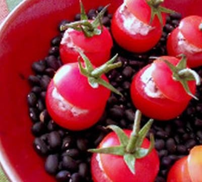 Mettez des haricots noirs ou tout autre légume sec au fond d'un bol pour maintenir et présenter les tomates. Farcissez les tomates de crème au fromage et posez le chapeau de la tomate dessus.