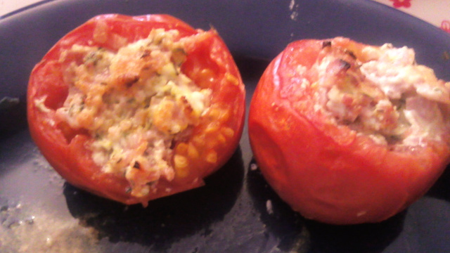 Fourrer les tomates avec ce mélange et saupoudrer le dessus de parmesan râpé.